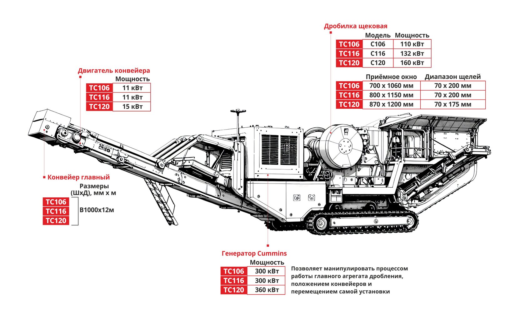 Преимущества: Полная мобильность – гусеничное шасси позволяет быстро перемещаться между объектами и работать в труднодоступных местах. Высокая производительность (до 400 т/ч) и надежность за счет мощной конструкции и износостойких материалов. Гидравлическая регулировка зазора щек для точного контроля размера продукта. Экономичность – низкий расход топлива и простое обслуживание.
